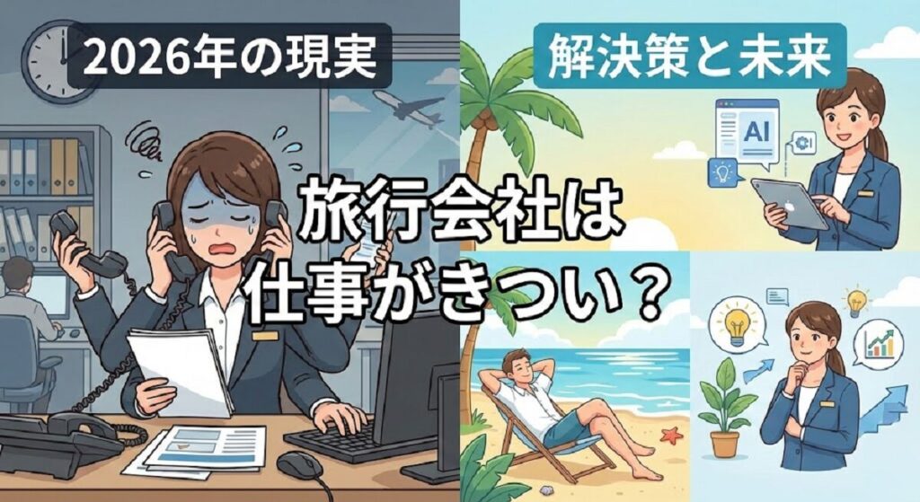 旅行会社の仕事は、外から見るとキラキラしていて楽しそうに見えますよね。色々な場所に行けたり、誰かの思い出作りをお手伝いできたりと、魅力的なイメージがあると思います。でも、実際に働いている人からは「もう限界」「体がもたない」という声がよく... -