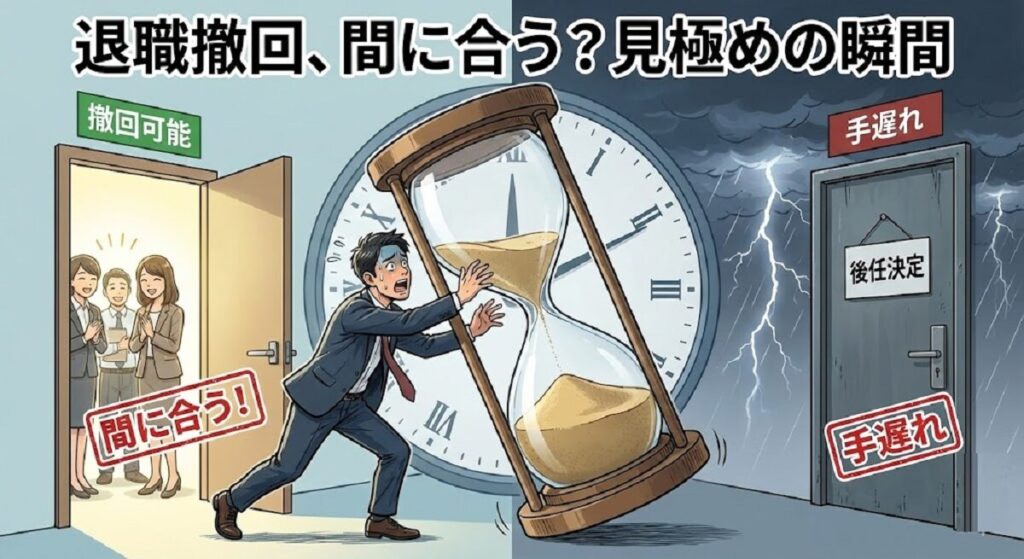 - ⇨ 法的にはアウトでも、実務的にはセーフです。 会社にとって「後任を探すコスト」が浮くため、喜んで撤回に応じる可能性があります。