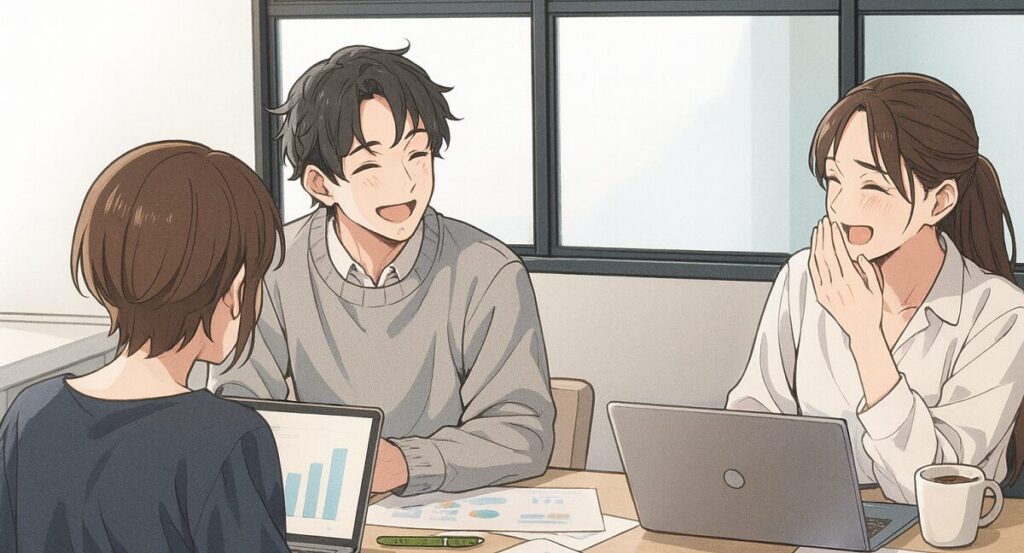雑談が苦手でも、聞き役に回ることで「一緒にいると安心する人」と思われることが多いです。実際に社内で信頼される人は「面白い話をする人」よりも「ちゃんと話を聞いてくれる人」であることが多いんです。だから、話すのが得意でなくても安心してください。聞き役で十分に信頼を得ることができます。あるケースが多いんです。つまり、雑談を盛り上げなくても、聞き上手になるだけで職場での信頼関係はしっかり築けます。