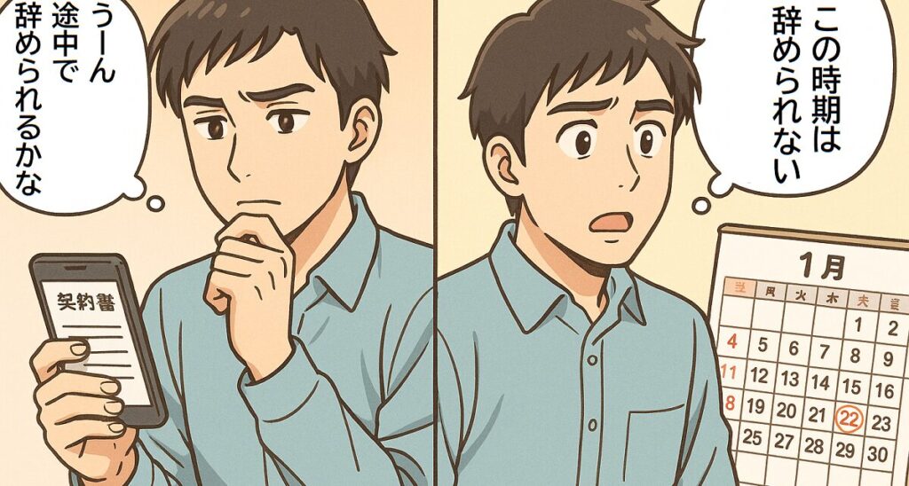 契約書に「1か月前」とあっても、アルバイトの場合は法律上2週間前に伝えれば辞められることが民法で定められています。事前に知っておくことで、強く引き止められても安心して対応できます。
